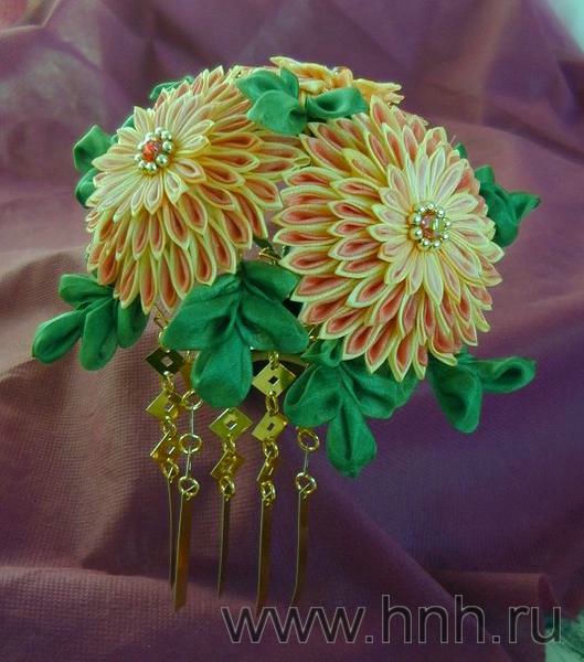 Тут правит бал любимица японцев - хризантема (kiku). Она не даром символизирует Императорскую Семью. Обычно хризантемы в канзаши красные и белые, это сочетание символизирует окончание осени.