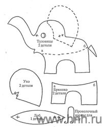 Получившиеся детали брюшка и туловища сшиваем по линии а-б, потом обе половинки туловища сшиваем вместе, место, на спине оставляя незашитым. Проделываем отверстие в материале и через это отверстие проденем проволочный каркас в ноги слоненка (можно и без него). Вшиваем клин между двумя половинками головы в места, которые обозначены на выкройке крестиками. Набиваем полученную форму ватой через незашитое на спине отверстие, потом отверстие зашиваем. Зашив на ушах выточки, пришиваем их к голове. Глазки лучше всего сделать из кожи или бусинок.